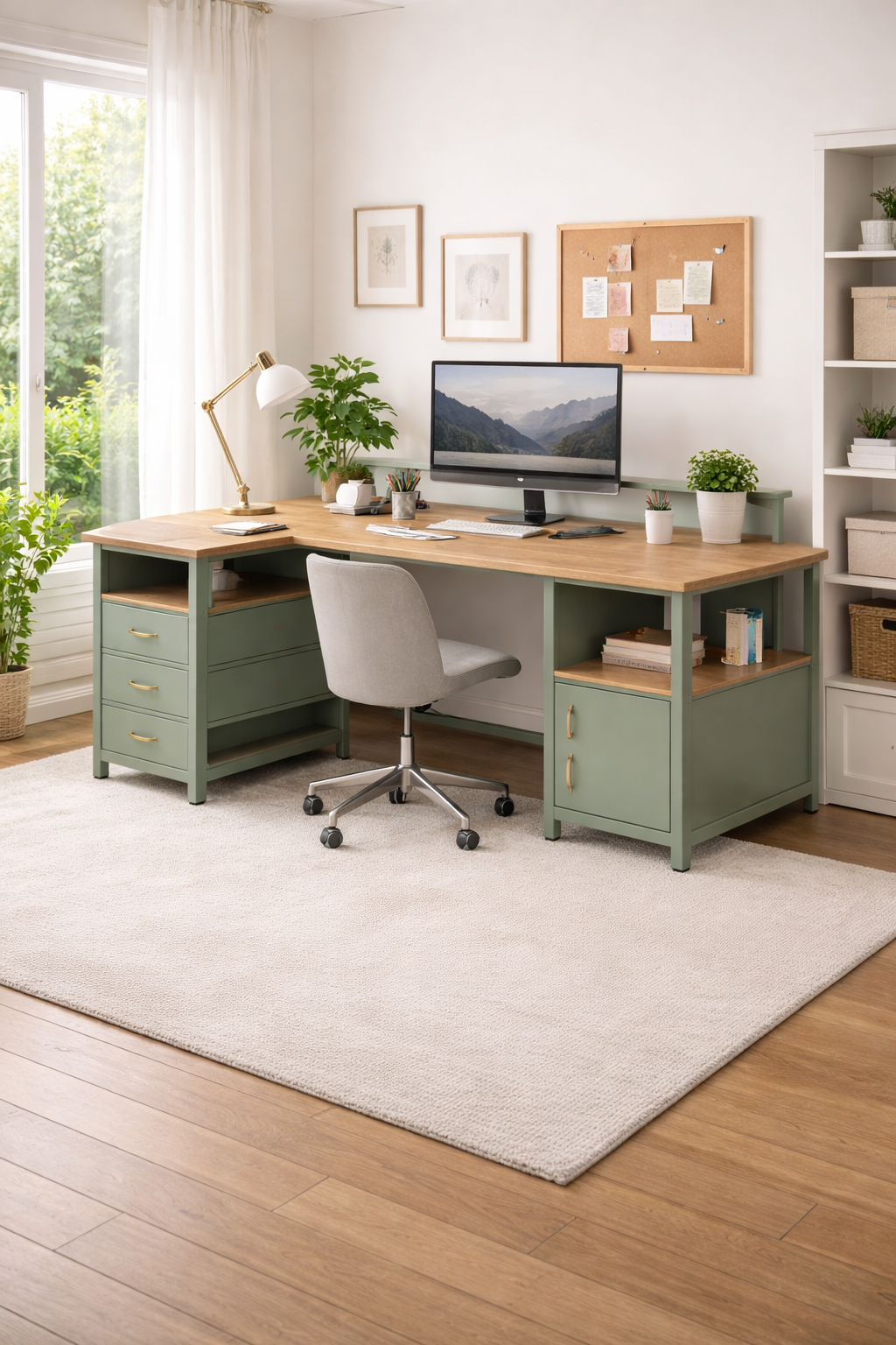 bureau angle plateau bois et structure verte tiroirs etagere laterale rangement pratique espace organise